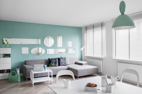 Nền màu tường màu xanh ngọc tạo hiệu ứng tươi mát, kết hợp với bộ sofa là gam màu trung tính.