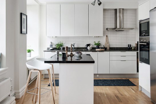 Sự kết hợp giữa các đồ dùng nội thất như tủ gỗ, màu tường với tông trắng làm chủ đạo trắng tạo hiệu ứng cơi nới không gian. Mặt sàn được lát bằng vật liệu gỗ công nghiệp mang đến sự nhấn nhá riêng cho gian bếp.