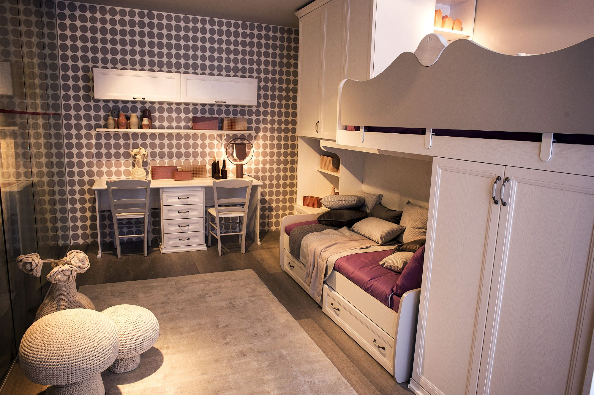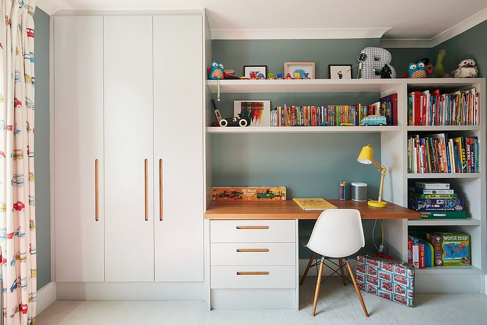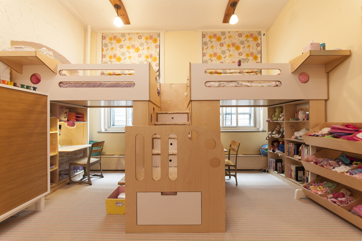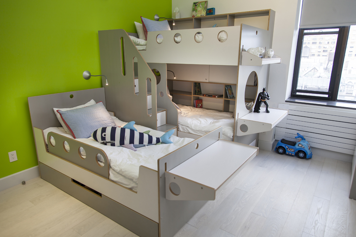 Không gian nhỏ nhưng bố trí khéo léo, bạn hoàn toàn có thể thiết kế khu vực riêng cho hai bé với góc học tập phía dưới.