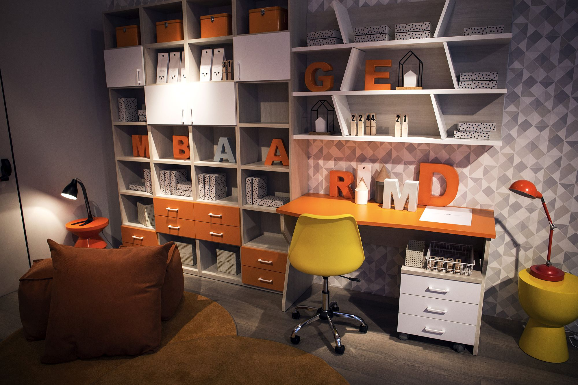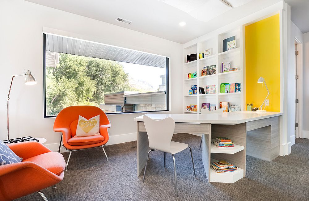 Căn phòng có diện tích hẹp nhưng cách sử dụng bàn màu trắng cùng thiết kế cửa sổ kính rộng giúp căn phòng trông thoáng hơn rất nhiều. Sắc vàng và cam nơi ghể ngồi làm không gian thêm sinh động.