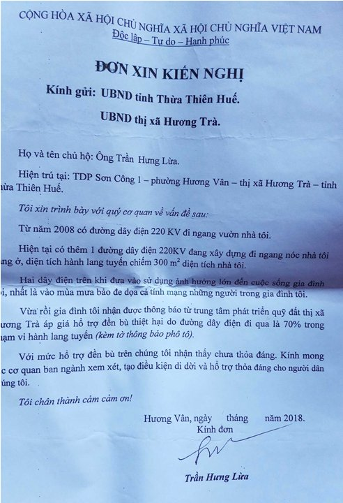 Hiện nhiều hộ dân đã có đơn gửi UBND thị xã Hương Trà cũng như UBND tỉnh Thừa Thiên Huế đề nghị xem xét, giải quyết chỗ ở...