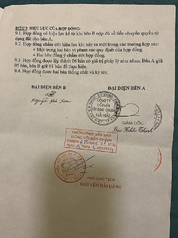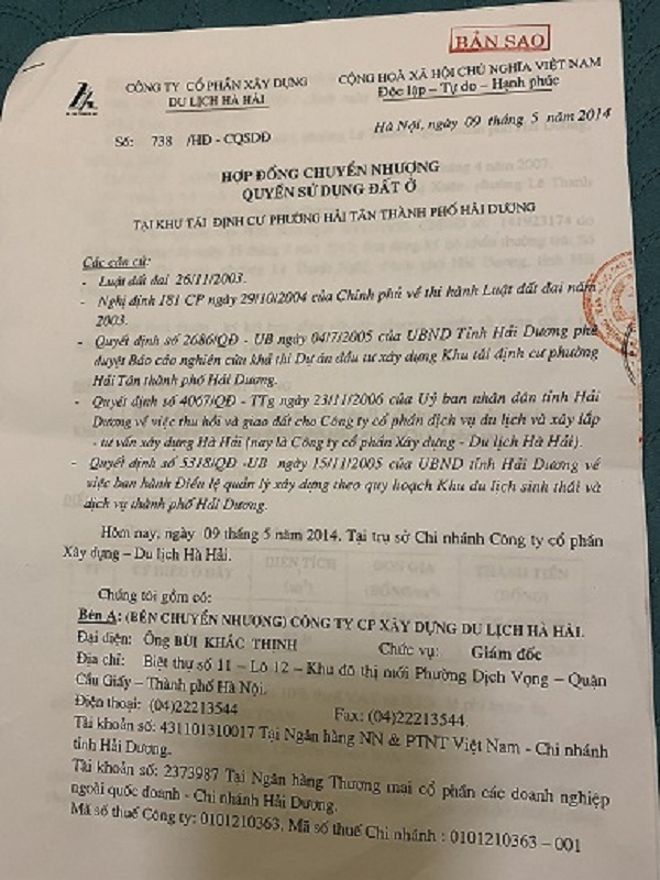 Sau đó, Công ty Cổ phần xây dựng Du lịch Hà Hải đã tiến hành làm Hợp đồng chuyển nhượng quyền sử dụng đất ở, cùng với lời hứa hẹn “chắc như đinh đóng cột” gia đình nộp đủ tiền; hoàn thành nộp nghĩa vụ thuế cho Nhà nước và cung cấp đầy đủ giấy tờ pháp lý, Công ty tiến hành làm ngay Giấy chứng nhận Quyền sử dụng đất.