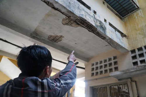Bà Liễu dẫn chúng tôi tham quan một vòng. Ngay tại lối cầu thang ra vào có một mái hiên bong tróc chỉ còn lớp sắt. Mấy năm trước, người dân ở đây phải góp tiền thuê thợ đến hàn khung sắt đỡ tạm, phòng ngừa sụp đổ.