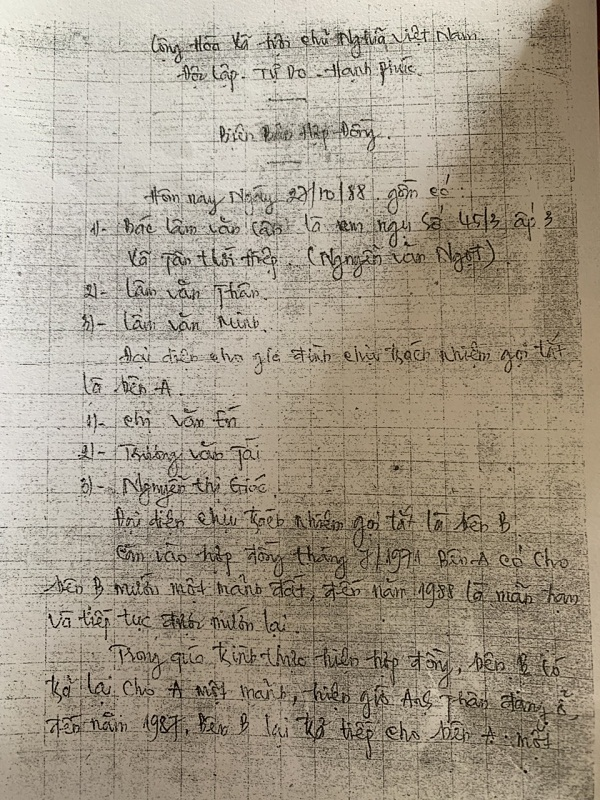 Trang đầu “Biên bản Hợp đồng” lập năm 1988 giữa các chủ cũ, các bên liên quan đến khu đất.