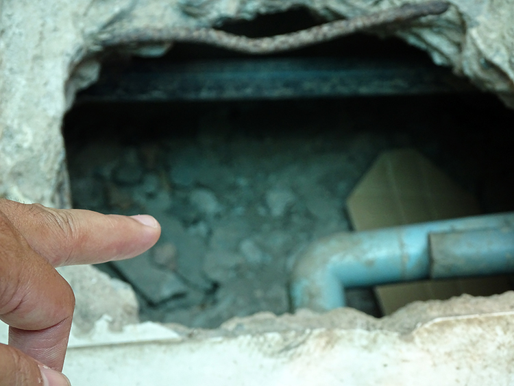 Hố sâu 40 cm trong mái hiên nhà ông Long. Ảnh: Hà An.
