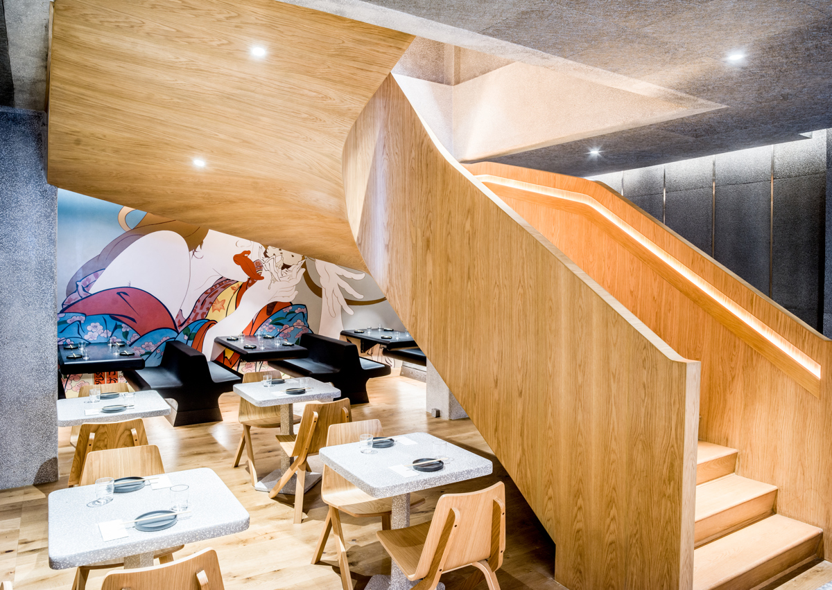 Được thiết kế bởi kiến trúc sư tên tuổi Sean Dix, từng thiết kế những công trình tiêu biểu như Yardbird và Ho Lee Fook ở Hong Kong, nội thất của Renkon kết hợp bê tông trần trụi với gỗ vàng để tạo ra ấn tượng mạnh về phong cách thô mộc đầy tính thẩm mỹ.