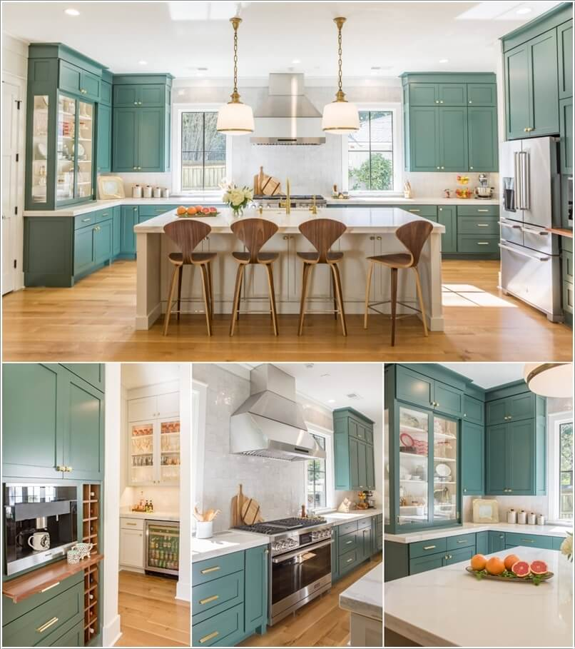 Sự kết hợp táo bạo giữa màu sắc ấm áp của sàn gỗ và dịu mát của màu xanh nơi tủ bếp.