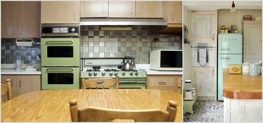 Trang bị nhà bếp với nội thất màu xanh theo phong cách hiện đại hoặc trào lưu retro.