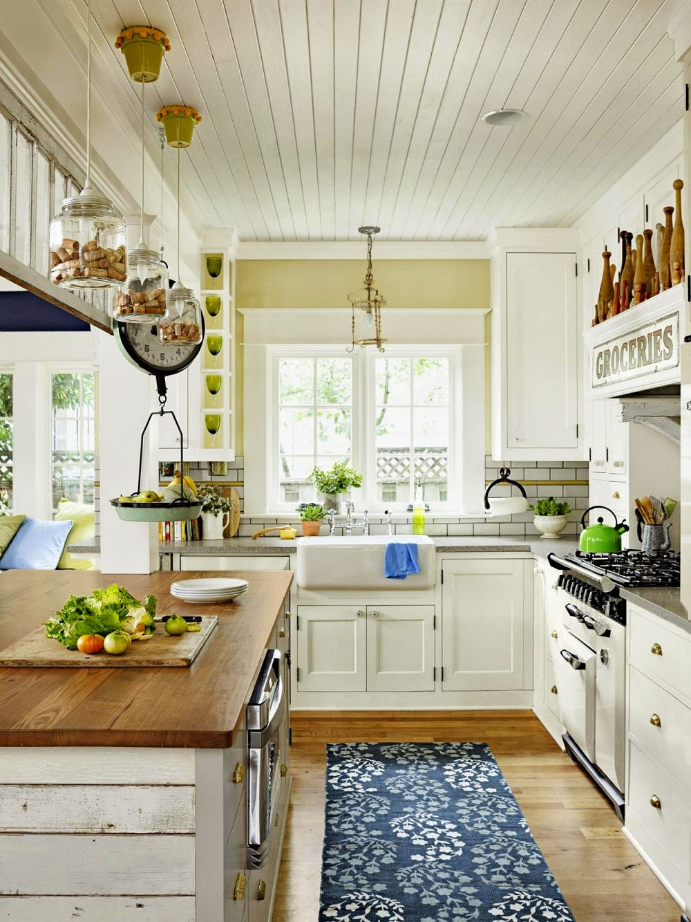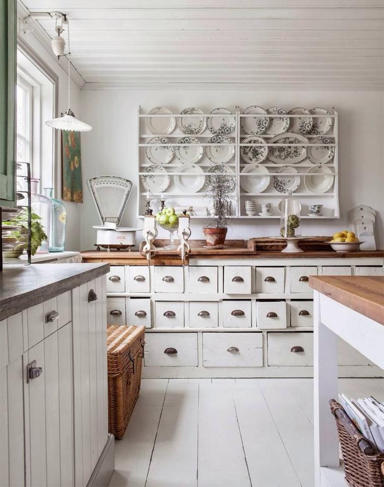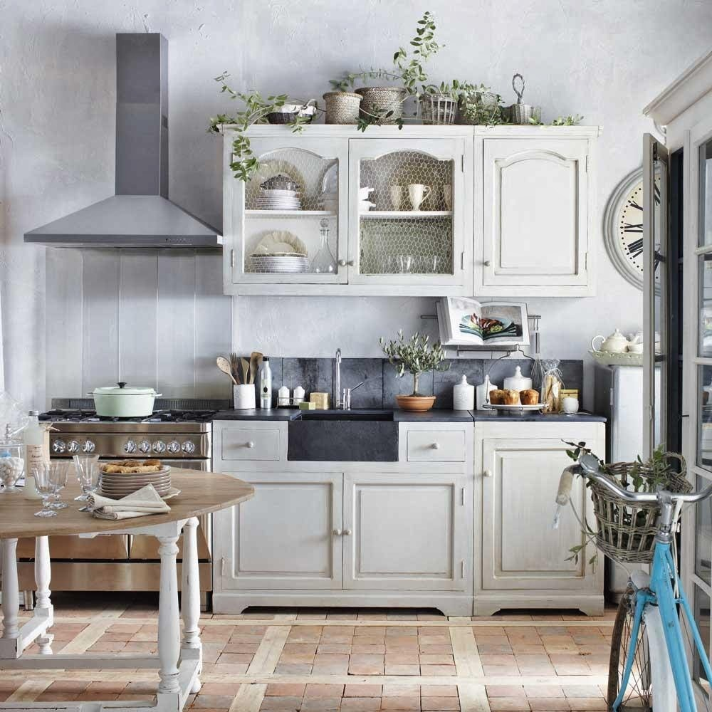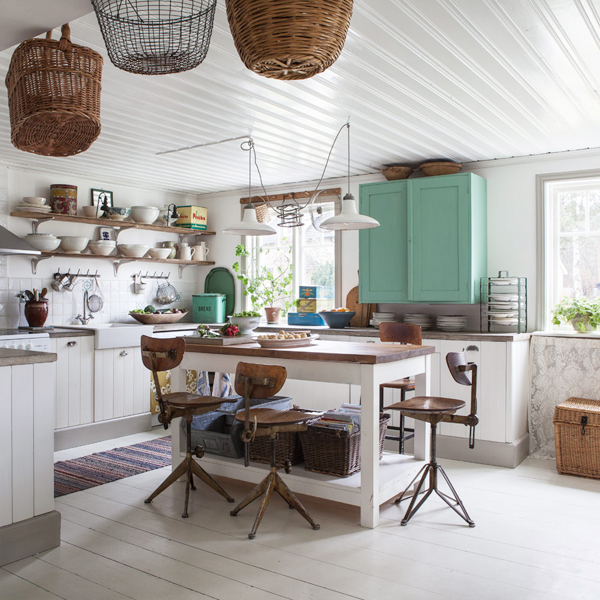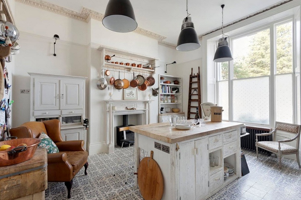 Một vài chi tiết như chiếc xe đạp đời cũ, đồng hồ kim số La Mã hay những chậu cây dây leo cũng góp phần tô điểm cho gian bếp đậm chất Shabby Chic và khá lạ mắt.