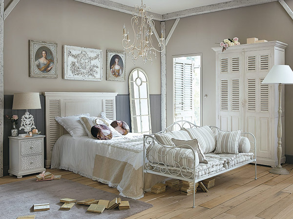 Điểm nổi bật khác của phong cách trang trí này là những vật dụng nội thất thường có xu hướng nhẹ nhàng, thanh thoát và phảng phất nét cổ điển. Điểm xuyết trên mảng tường trắng là tấm gương soi cùng những bức tranh treo tường đơn giản, không cầu kỳ càng làm không gian phòng ngủ có chiều sâu. Đây được xem là Shabby Chic đơn giản không biến tấu quá nhiều, nhưng vẫn mang lại cái nhìn tổng thể hài hòa, thanh nhã.