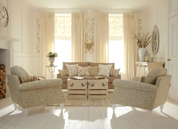 Nội thất phòng khách theo phong cách này thường là dãy sofa lớn bọc vải cùng chiếc đệm gối đã qua sử dụng hay làm giả theo xu hướng vintage. Hoặc thay thế ghế sofa đệm bằng sofa chất liệu gỗ cũng là sự lựa chọn rất hay cho phong cách này. Một mẹo để biến tấu ghế gỗ trở nên lạ mắt hơn là bạn có thể sơn lên chúng từ 1 – 2 lớp sơn, bằng cách cọ sơn giống như tranh sơn mài hay phủ lên trên bề mặt ghế một lớp mỏng, sau đó lấy giấy nhám chà xát trên bề mặt để tạo cảm giác “cũ kỹ”.