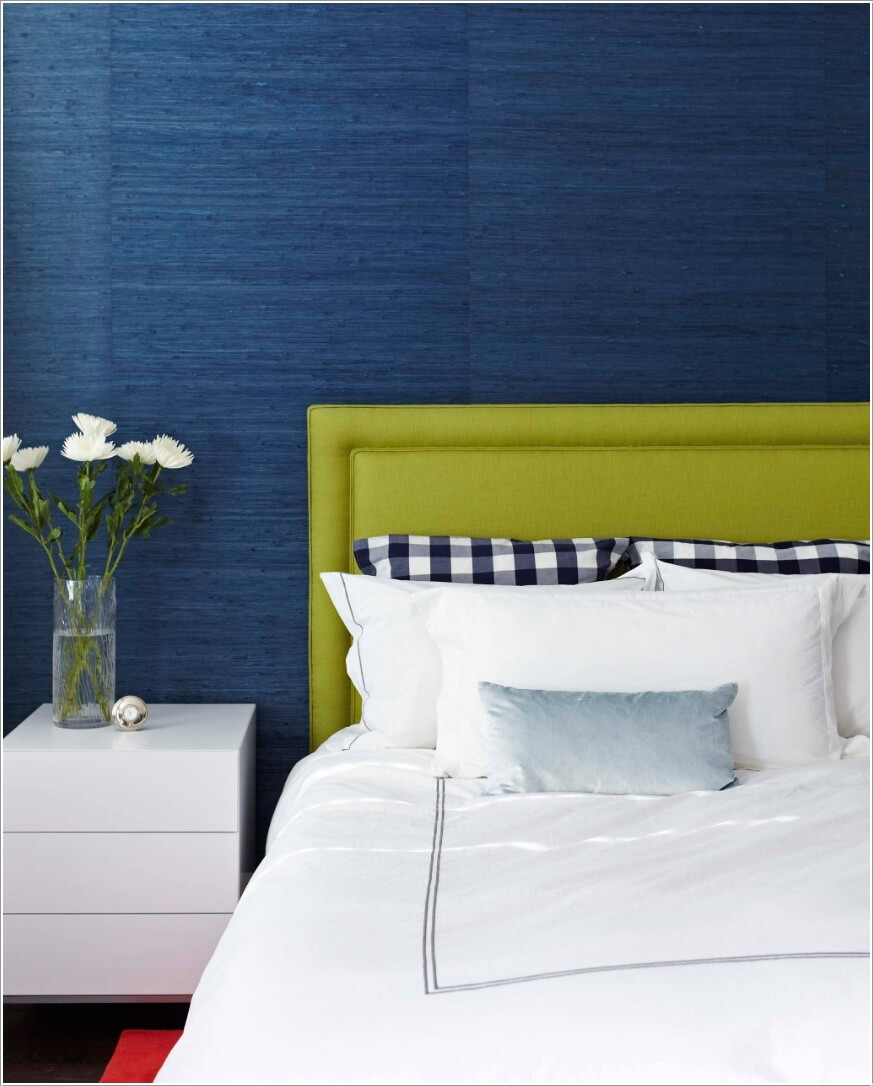 Ở căn phòng này, chủ nhân sử dụng màu sắc tương phản giữa rèm cửa, đầu giường và vỏ chăn giúp phòng ngủ trở nên nổi bật.