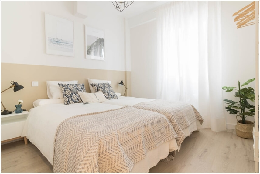 Màu sắc trung tính sơn tường phía sau giường hài hòa với màu sắc của giường và vỏ chăn.