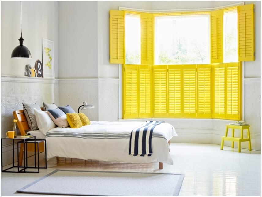 Căn phòng nổi bật với màu sắc vàng nơi cửa sổ tương phản với tông trắng chủ đạo.