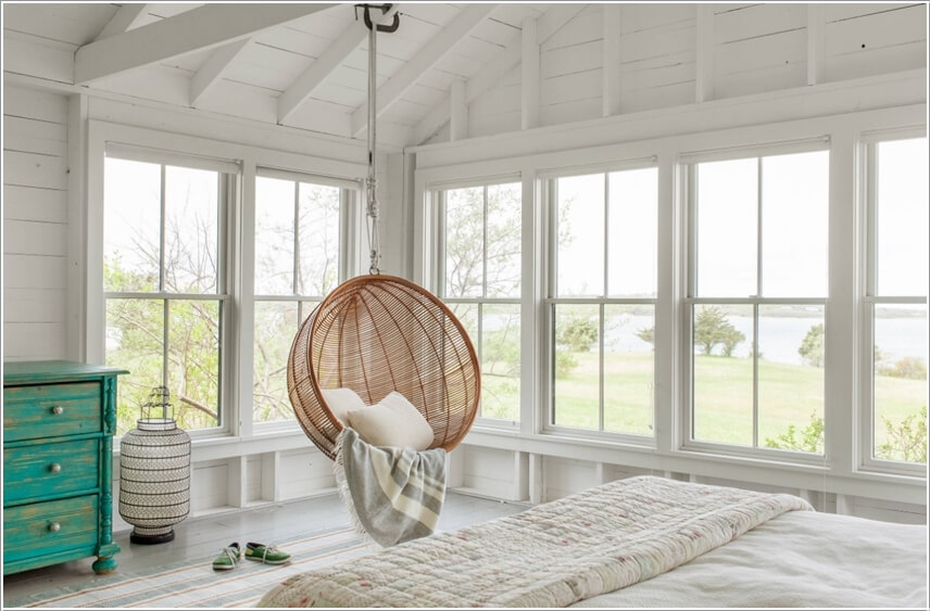 Ghế xích đu được đan bằng mây truyền thống trong căn phòng hiện đại.