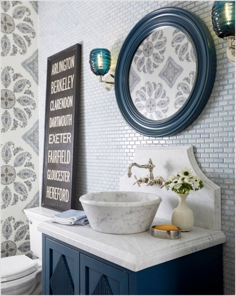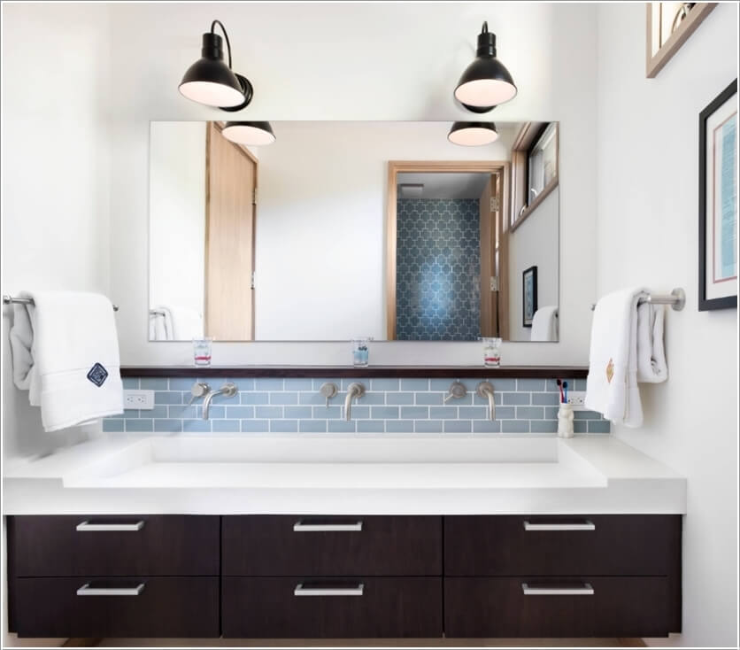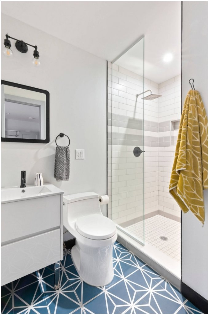 Sàn được lát bằng gạch màu xanh trắng tạo giai điệu đầy màu sắc cho toàn bộ phòng tắm trong viền đen của gương và đèn chiếu sáng mang lại cảm giác sang trọng.