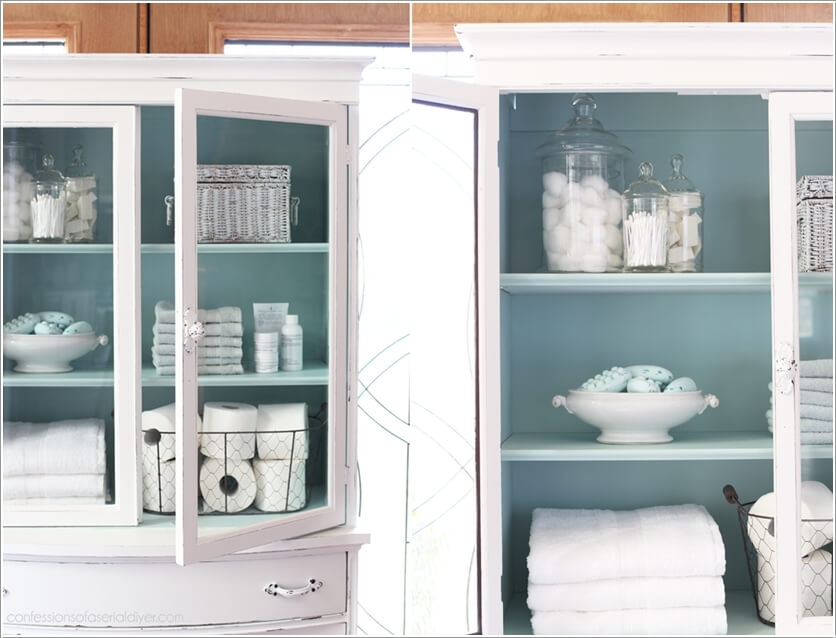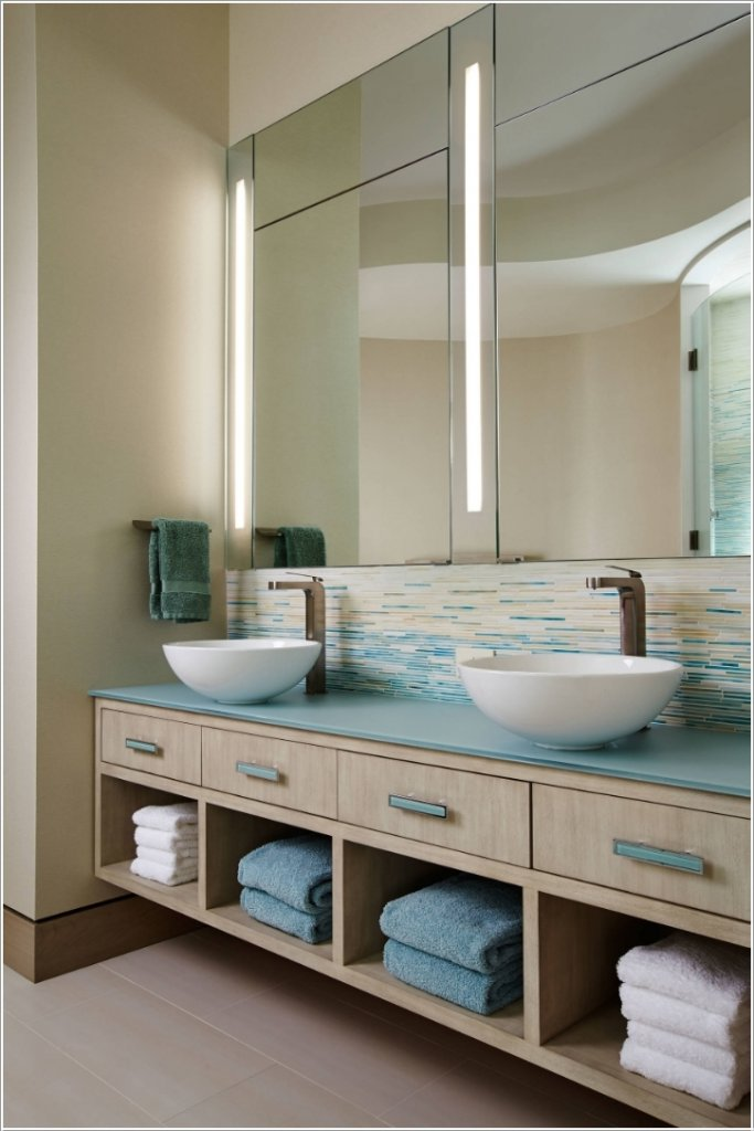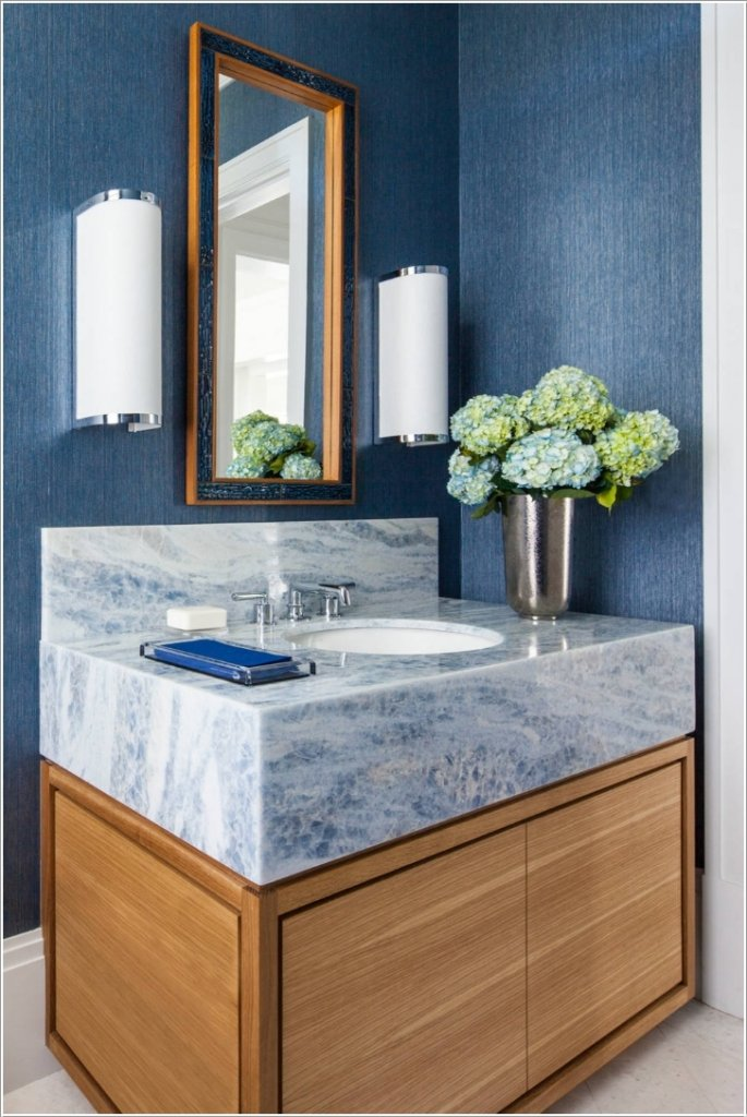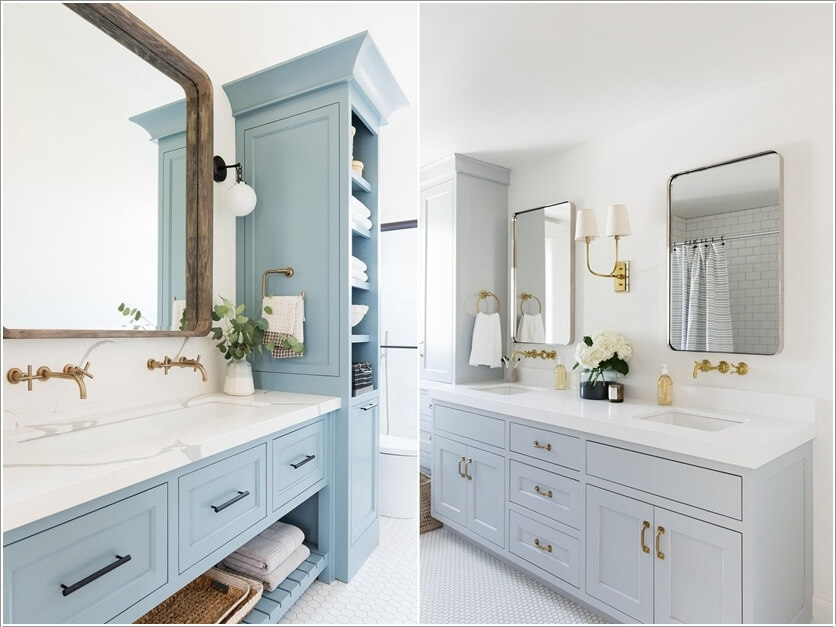 Sử dụng sàn gạch màu xanh cùng với sơn xanh trên tủ và viền gương khiến căn phòng thêm mát mẻ hơn khi mùa hè đến.