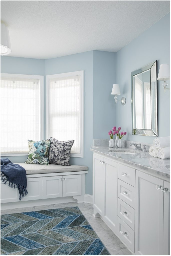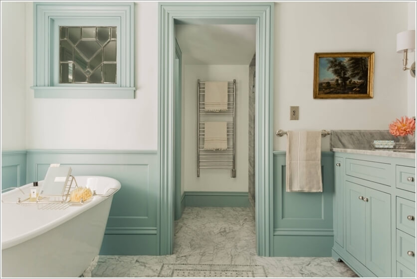 Sự kết hợp nhẹ nhàng của bức tường màu xanh nhạt cùng sàn gạch trong không gian màu trắng của phòng tắm tạo cảm giác tươi mới.