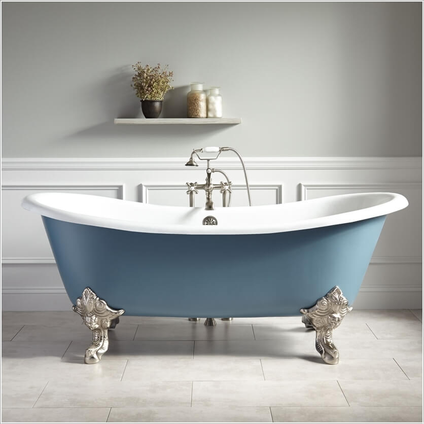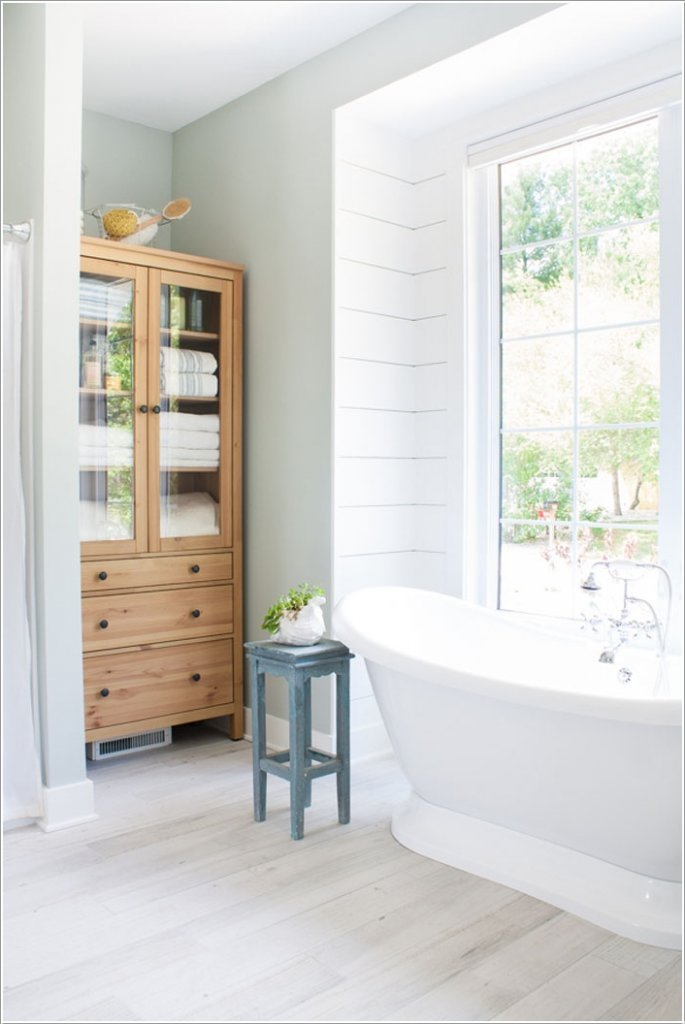Đặt một chiếc ghế màu xanh dọc theo bồn tắm.