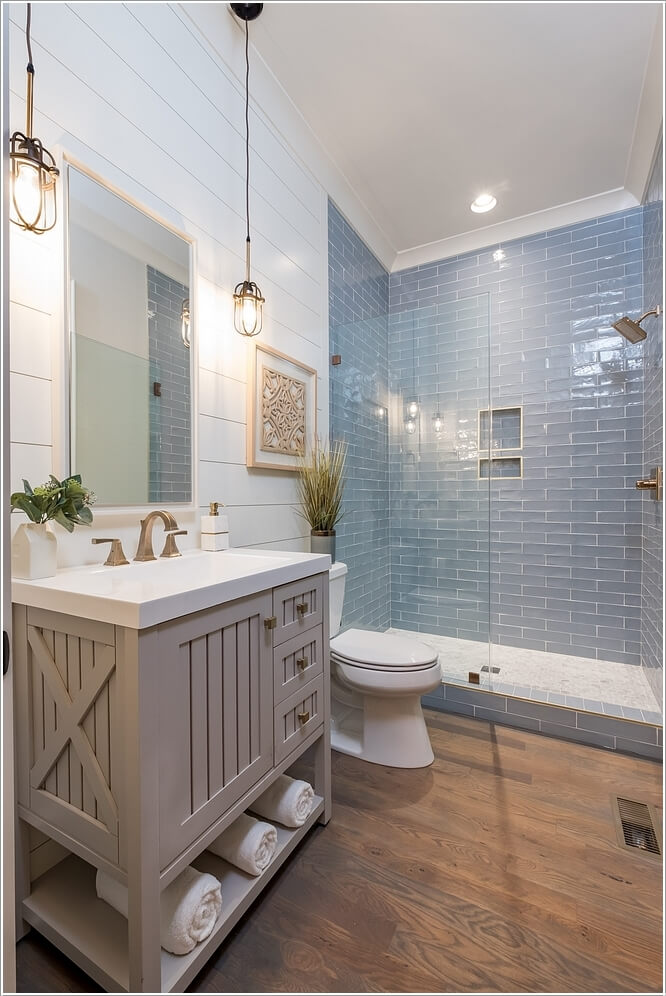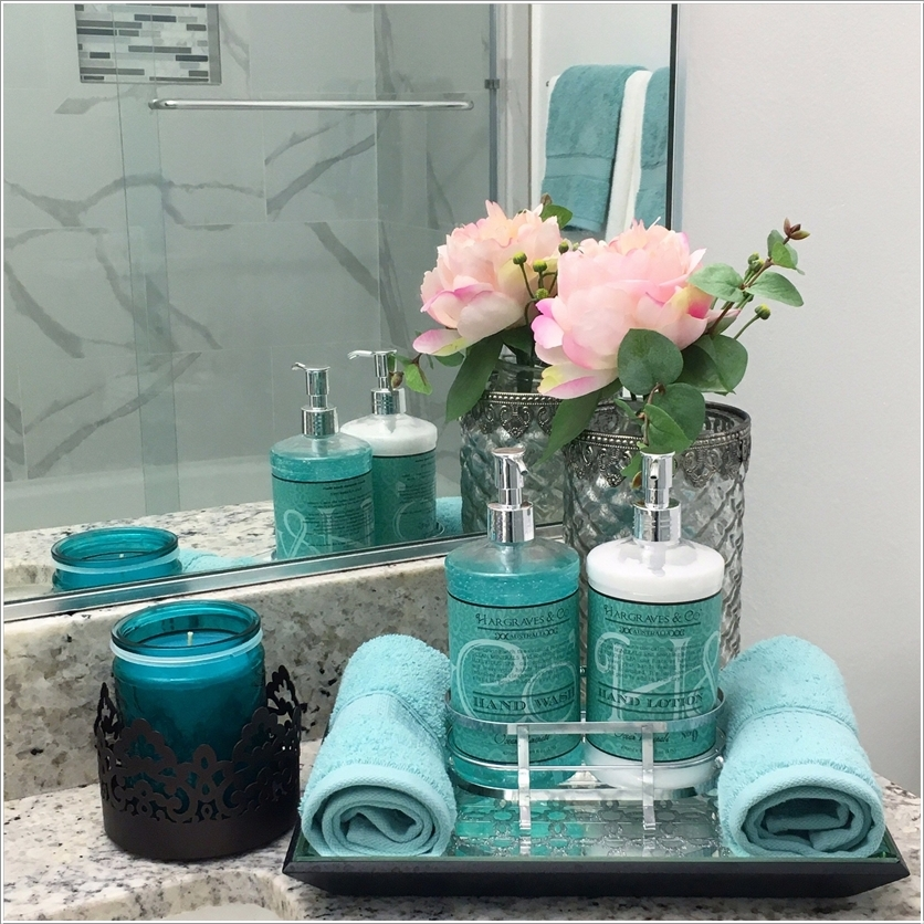 Nếu không muốn thay đổi trang trí của căn phòng, bạn có thể thêm các phụ kiện như khăn tắm hay nến,... màu xanh để mang lại cái nhìn dịu nhẹ hơn cho phòng tắm.