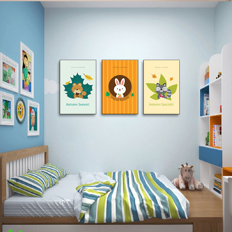 Phòng ngủ trẻ em là nơi nuôi dưỡng những tâm hồn ngây thơ, trong sáng nên thường được đặt những bức tranh có màu sắc sáng sủa, vui tươi phù hợp với lứa tuổi. Những bức tranh chủ đề động vật nhiều màu sắc được treo trên tường của phòng ngủ này.