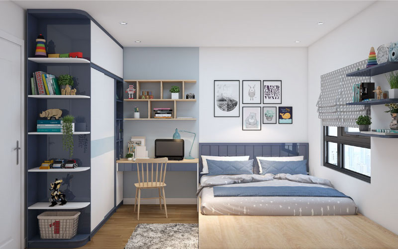 Phòng ngủ trẻ em có sự đồng bộ từ viền khung ảnh, viền tủ quần áo, viền cửa sổ đến giường ngủ tạo nên tổng thể hài hòa, thú vị.