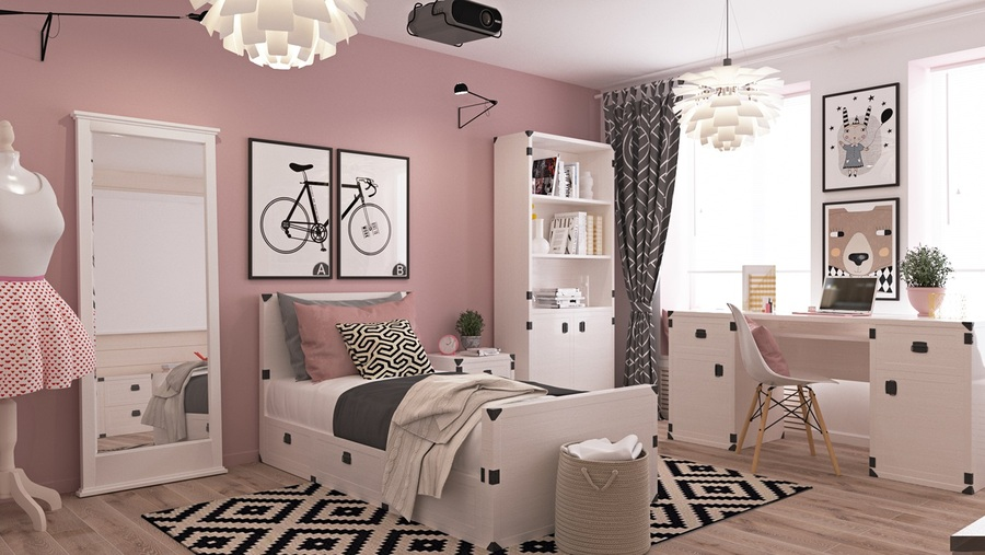 Phòng ngủ màu hồng dành cho những cô bé được treo những bức tranh chủ đề nhẹ nhàng với khổ ảnh tự do được ghép lại hoàn hảo.