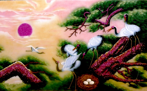 Tranh thêu tùng hạc diên niên với sự tỉ mỉ của từng đường kim, mũi chỉ đã tạo ra một bức tranh hoàn hảo với màu sắc rực rỡ, sắc nét không kém những loại tranh khác.