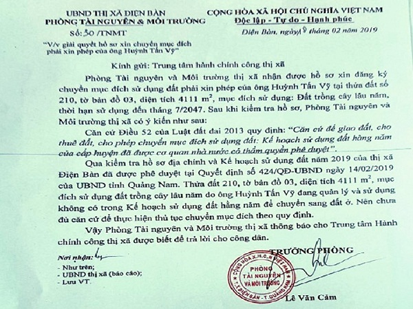Ngày 7/01/2019, ông Huỳnh Tấn Vỹ có đơn xin phép chuyển mục đích sử dụng đất gửi UBND thị xã Điện Bàn về việc xin chuyển mục đích 4.111m2 đất trồng cây lâu năm nói trên để sang mục đích đất ở, thời hạn sử dụng lâu dài. Sau khi xem xét hồ sơ xin chuyển mục đích sử dụng đất của ông Vỹ, ngày 18/2/2019, Phòng TN&MT thị xã Điện Bàn có Công văn số 30/TNMT về việc giải quyết hồ sơ xin chuyển mục đích phải xin phép của ông Huỳnh Tấn Vỹ.