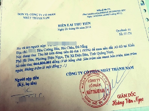 Biên lai thu tiền đặt cọc mua đất nền do ông Hoàng Văn Ngọc – Giám đốc Công ty CP Nhất Thành Nam ký. Ảnh: Đoàn Hồng.