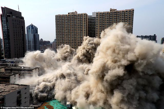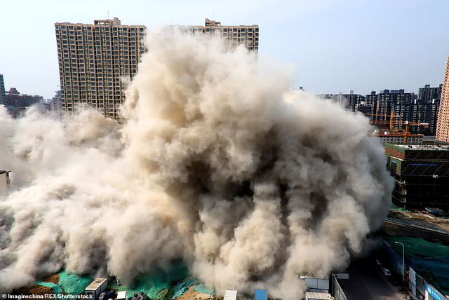 Theo Dailymail, đoạn video được quay vào chiều ngày 31/5 tại thành phố Trịnh Châu, tỉnh Hà Nam. Giới chức địa phương đã dùng 1,1 tấn thuốc nổ kéo sập 2 tòa nhà 20 tầng chưa xây xong vì chúng đã vi phạm luật xây dựng. (Ảnh: VCG)