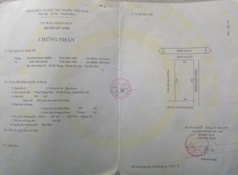 Sau khi đấu giá thành công, ông được UBND huyện Kỳ Anh cấp Giấy Chứng nhận quyền sử dụng đất số AD 215238 với diện tích 160m2, mục đích sử dụng làm đất ở lâu dài.