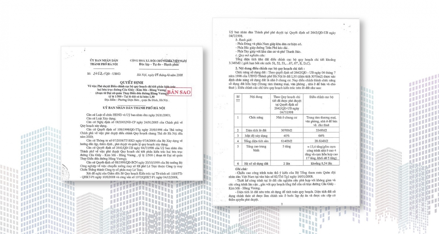 Ngày 05/12/2008, Chủ tịch UBND TP Nguyễn Thế Thảo đã ký Quyết định số 2452/QĐ-UBND về việc Phê duyệt điều chỉnh cục bộ quy hoạch chi tiết phần kiến trúc hai bên trục đường tỷ lệ 1/500 tại lô đất này. Theo đó, chiều cao công trình không vượt quá 70m và số tầng không quá 20 tầng. Theo quy định của pháp luật, đây là văn bản quy phạm pháp luật, mọi quy định của văn bản này sẽ “được Nhà nước bảo đảm thực hiện”, trừ khi có những văn bản ở cấp cao hơn bãi bỏ.