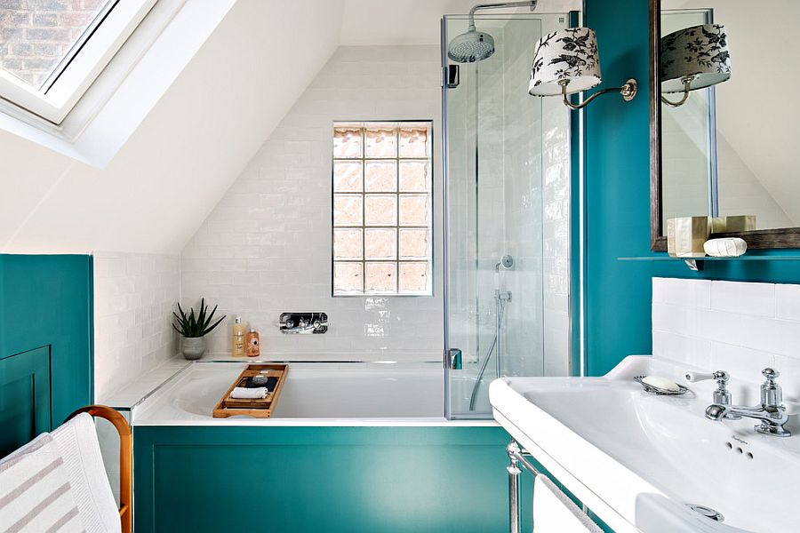 Khi nói đến màu sắc phòng tắm mùa hè, màu xanh và trắng nổi bật như là tông màu được ưa thích nhất. Nhưng năm nay, hãy thử một thứ gì đó táo bạo và khác biệt hơn bằng cách sử dụng teal (màu xanh lá cây ánh xanh lam). Một màu sáng hơn nhiều so với màu ngọc lam và linh hoạt hơn rất nhiều trong việc sử dụng nó, teal trong nhiều sắc thái của nó thực sự có tác động lớn.