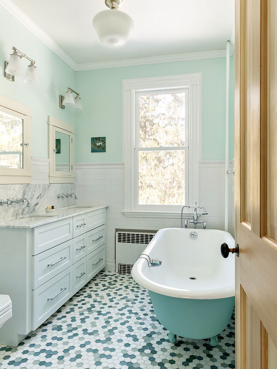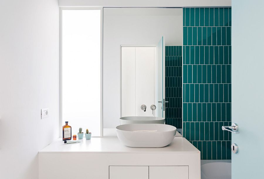Hãy thử các sắc thái khác nhau của màu xanh trong phòng tắm với phông nền trắng.