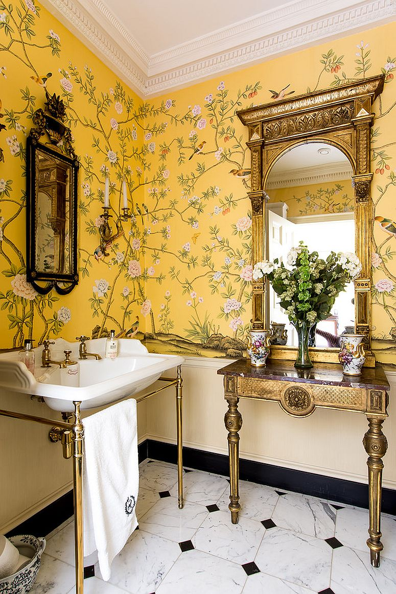 Sử dụng màu vàng trong phòng tắm theo phong cách đồng quê sang trọng.