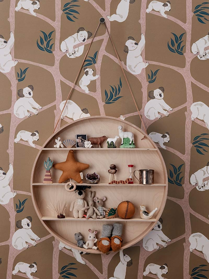 Bức tường được bao phủ bởi hình cây và nhiều con gấu túi Koala. Phông nền hoàn hảo cho căn phòng dành cho những bé thích phiêu lưu và mơ mộng.