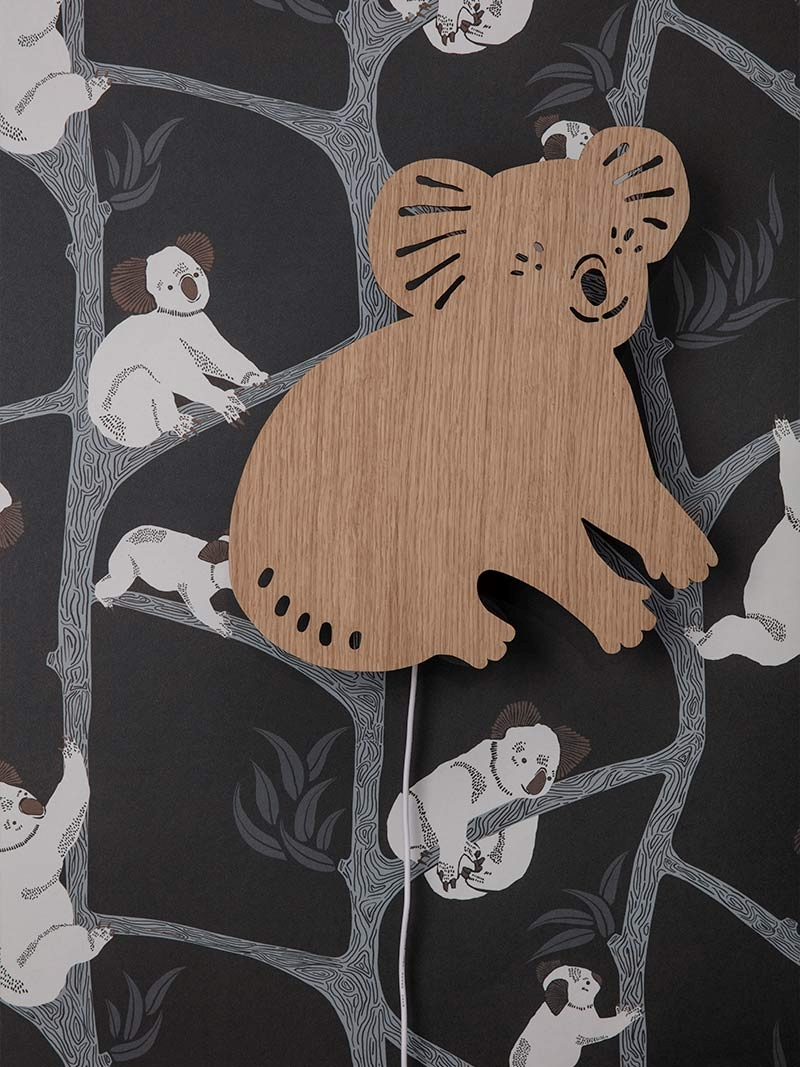 Phòng bé được trang trí với chiếc đèn Koala gắn trên tường.