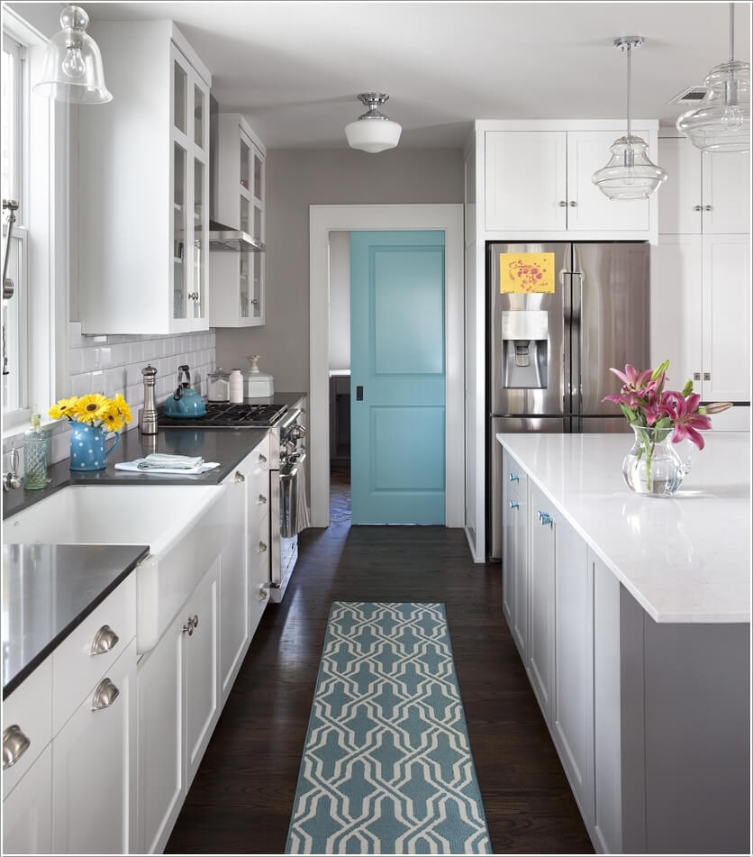 Sơn cửa bếp và thêm một tấm thảm với cùng màu, tạo nét thu hút trong căn bếp hiện đại.