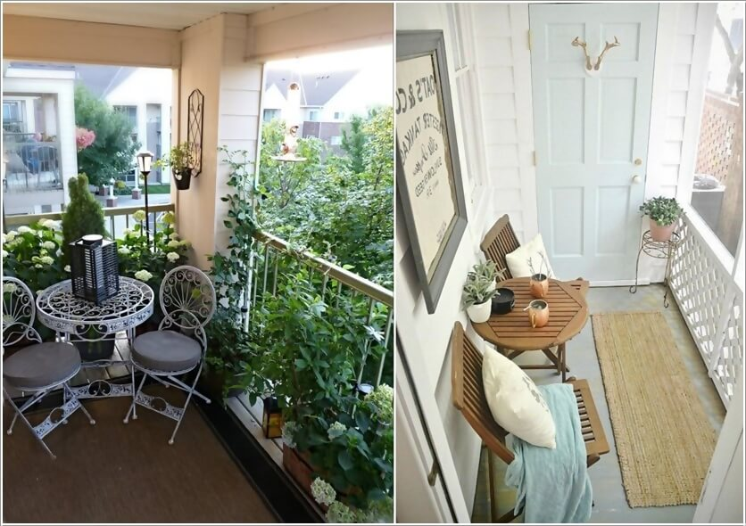 Ban công được đặt thêm bộ bàn ghế nhỏ xinh và trồng nhiều cây xanh.