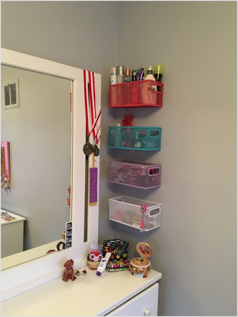 Tăng cường không gian lưu trữ phòng tắm bằng cách sửa các thùng lưới kim loại đầy màu sắc trên tường.
