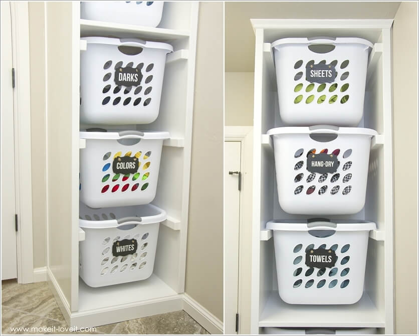 Phân loại đồ giặt với ngăn kéo giỏ nhựa trong khung gỗ giá rẻ.