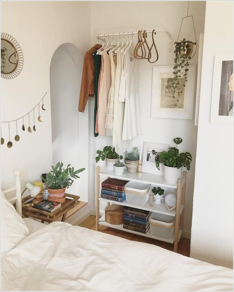 Nếu bạn không có tủ quần áo, bạn có thể tạo một cái chỉ bằng một ống kim loại đơn giản được cố định trên tường.