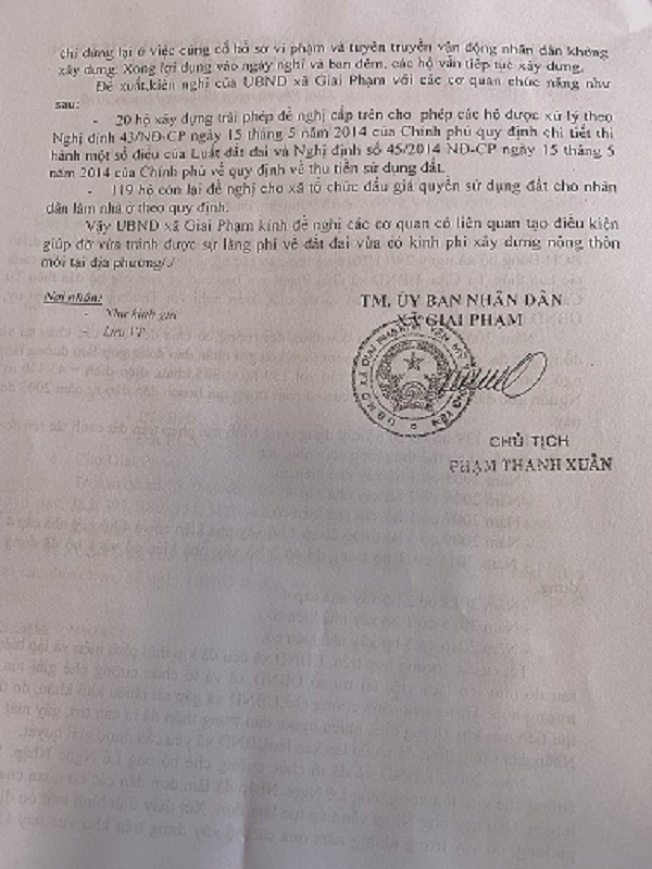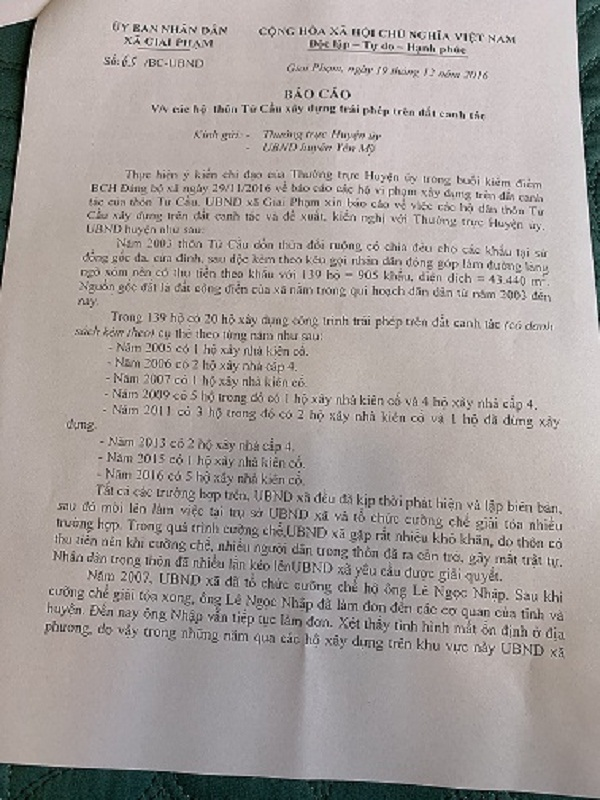 Báo cáo của UBND xã Giai Phạm về việc xây dựng công trình trên đất nông nghiệp ở thôn Tử Cầu