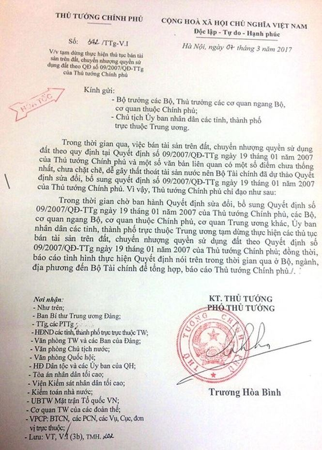Đồng thời hoàn chỉnh báo cáo kết luận kiểm tra việc bán tài sản trên đất và chuyển nhượng quyền sử dụng đất tại số 8 Mạc Đỉnh Chi và số 19 Nguyễn Thị Minh Khai, báo cáo Thủ tướng Chính phủ trước ngày 1/3/2017".