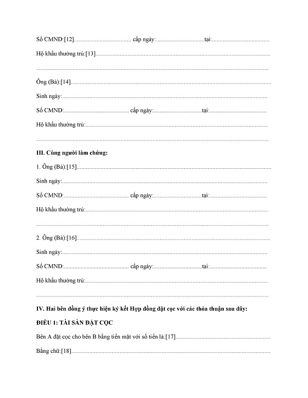 -[15],[16] Tại nơi kí hợp đồng đặt cọc mua bán nhà/ đất, nếu có người làm chứng hợp pháp theo quy định của pháp luật: ghi họ tên, ngày sinh, CMND/căn cước công dân, hộ khẩu thường trú của người làm chứng theo sổ hộ khẩu đã được cấp tại nơi cư trú;