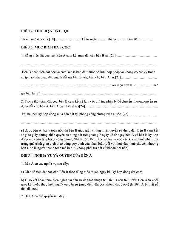 -[19]Thời hạn đặt cọc: số ngày và thời gian đặt cọc được ghi nhận kể từ thời điểm bên B nhận tiền đặt cọc từ bên A đến khi hai bên lập và ký Hợp đồng chuyển nhượng quyền sử dụng đất, nhà ở và tài sản gắn liền với đất tại Tổ chức hành nghề công chứng, bên A sẽ thanh toán số tiền còn lại.