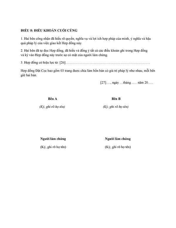 -Hiệu lực của hợp đồng được ghi vào mục [26] khi bên B nhận tiền đặt cọc, bên A nhận hóa đơn thanh toán tiền đặt cọc và bản sao các giấy tờ liên quan về nhà/đất nhận chuyển nhượng;