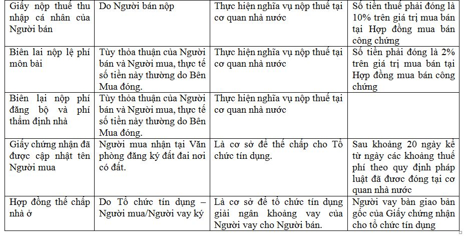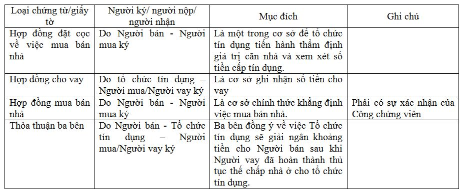 Dưới đây là tổng hợp các loại chứng từ, giấy tờ cơ bản cần có khi mua nhà ở và thế chấp tại tổ chức tín dụng do tác giả đúc kết từ thực tiễn, thực tế có thể sẽ thay đổi tùy theo chính sách của từng tổ chức tín dụng cụ thể (nếu có) như sau:
