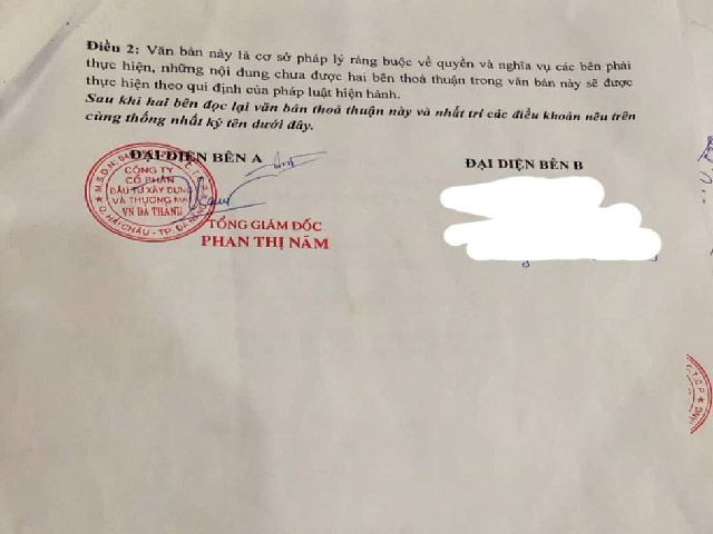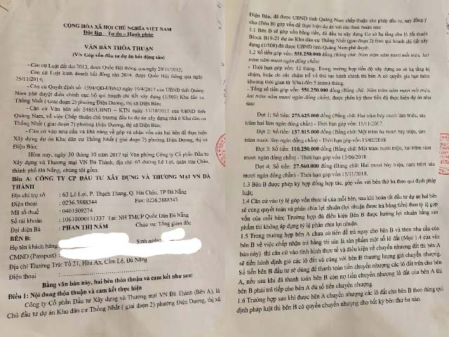 Tương tự, ngày 30/10/2017, bà H.T.D (trú ở Phường Hòa An, quận Cẩm Lệ, TP.Đà Nẵng) ký kết hợp đồng hợp tác với văn bản thỏa thuận góp vốn bằng tiền với Công ty Cổ phần Đầu tư Xây dựng và Thương mại VN Đà Thành để mua lô đất thuộc Block B19-21. Theo đó, bà H.T.D sẽ góp vốn cho chủ đầu tư với số tiền 551.250.000 đồng. Theo văn bản này, thời gian góp vốn của bà H.T.D theo từng giai đoạn, mỗi giai đoạn phải nộp cho chủ đầu tư số tiền khác nhau. Trong văn bản góp vốn, chủ đầu tư có quyền kéo dài thời gian nếu tiến độ xây dựng cơ sở hạ tầng bị chậm, hoặc do các chậm trễ về thủ tục hành chính...
